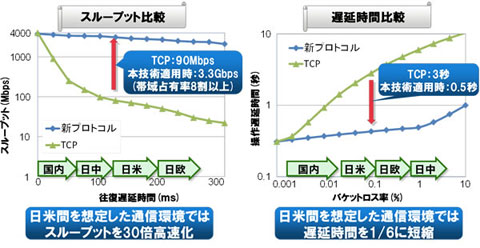 これにより、標準的なTCPを利用する場合と比べて、日米間を想定したファイル転送で30倍以上のスループット向上を実現するほか、パケット送達時間に伴う操作の遅延時間を1/6以下に短縮する。