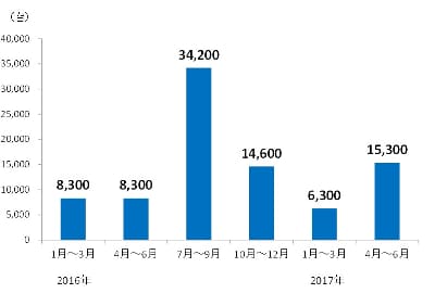 2017年上半期は、オンライン銀行詐欺ツール(※5)の国内検出台数が3万3,900台(1月~3月:6,700台、4月~6月:2万7,200台)となり(グラフ4)、昨年同期比で約1.3倍に増加しました(2016年1月~6月:2万5,500台)。特に、2016年半ばから国内ネットバンキング利用者の情報を狙う活動を本格化させた「URSNIF(アースニフ、別名:Gozi・DreamBot)」は、2017年に入っても引き続きメールによる大規模な拡散を確認しています。元来、匿名化ネットワークを利用した通信内容の隠蔽工作など巧妙化が進んできた「URSNIF」ですが、2017年5月にはブートキットを利用して検出回避を行うものや、6月には国内の仮想通貨取引所の利用者の情報を狙うものを確認しました。国内では引き続き「URSNIF」の改悪・拡散が続いており、引き続き注意が必要です。