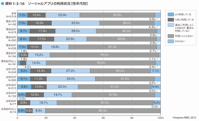 今回の利用動向調査ではこのほか、mixiやFacebook、Mobage、GREEなど「SNS」全体の利用率が昨年の32.1%から45.6%へと上昇した一方で、SNS上で利用する“ソーシャルアプリ”の利用率が40.1%から19.6%へと大幅に低下したことが分かった。
