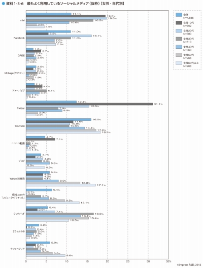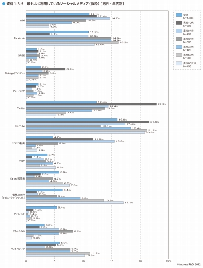 最もよく利用しているソーシャルメディアとしても「YouTube」(16.0%)がトップで、以下、「Twitter」(12.4%)、「mixi」(11.1%)、「Facebook」(11.0%)と続く。