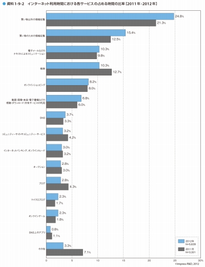 インターネット利用時間におけるサービスの占める時間の比率で最も大きいのは、「買い物以外の情報収集」で24.8%。昨年の21.3%から増加した。これに次ぐ「買い物の情報収集」も15.4%と、12.5%から増加している。