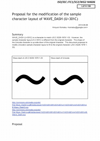 2014年9月29日から10月3日にかけて、スリランカのコロンボで国際文字コード規格を審議するWG2会議が開催された。この会議において、WAVE DASH(符号位置U+301C)の例示字形を変更をする提案、文書番号「N4606」[*1](図1)が審議され、特に反対が出ないまま、無事に勧告として承認された[*2]。この勧告は、今年中ごろに発行を予定されるUnicode 8.0でも反映される予定だ。