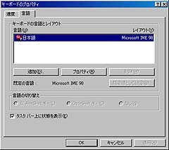 「キーボードのプロパティ」で、「言語」タブを選択して、使用している漢字変換システム(IME98)のプロパティを表示します