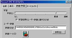 IME98のプロパティで「辞書/学習」タブを選択し、「辞書ツール」アイコンをクリックします。