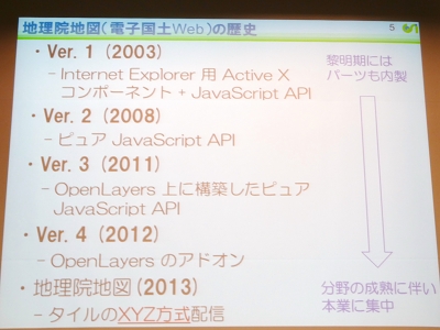藤村氏は、2015年7月で12周年を迎えた「地理院地図」(誕生時の名は「電子国土ポータル」で、「電子国土Web」と呼称した時代もあり)の地図データ/システム配信について、これまでの変遷を紹介した。2003年に、IE用ActiveXコンポーネントおよびJavaScript APIからスタートし、5世代目となった現在は国土地理院製のソフトウェアを無くして、タイルのXYZ方式配信に切り替えている。