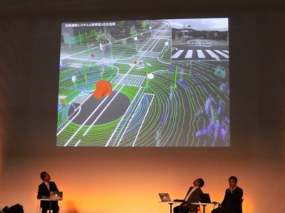 このほか、最近になって注目を集めている「自動運転システム」をテーマとしたパネルディスカッションもメインステージにて行われた。「自動運転システムと高精度3次元地図」と題したこのプログラムでは、東京大学空間情報科学研究センター・特任准教授の中條覚氏がモデレーターとなって、名古屋大学大学院情報科学研究科・准教授の加藤真平氏と、名古屋大学未来社会創造機構・教授の高田広章氏がパネリストとして参加した。