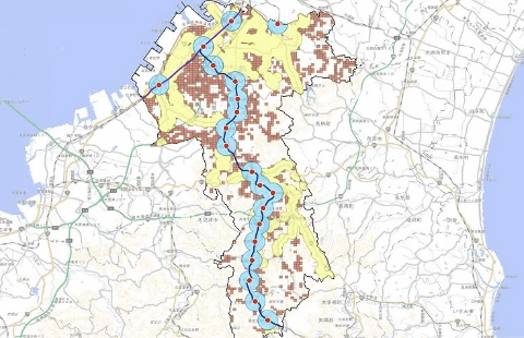 国土数値情報の高潮浸水想定区域データを利用して、想定される最大浸水域を浸水深の区分ごとに色分け表示した簡易的なハザードマップで、役場や鉄道路線や高潮浸水リスク、人口などのレイヤーの表示・非表示を切り替えられる。