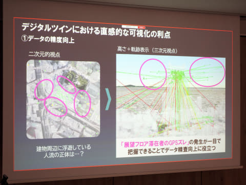 上記の手法で3次元人流データを表現することで、例えば展望フロアの滞在者の中に、GPSの位置情報の誤差によって上空に浮遊しているように見える位置情報が一目瞭然となり、データの精度向上に役立つことが確認できた。また、エレベーターを使った移動など2Dでは判別できなかった移動の状況も把握できるようになった。このほか丸居氏は、実証事業において関係者と議論する際に、3Dの可視化ツールを使うことで活発なディスカッションが生まれ、新たな気付きやインサイトの創出につながったことも利点として挙げている。