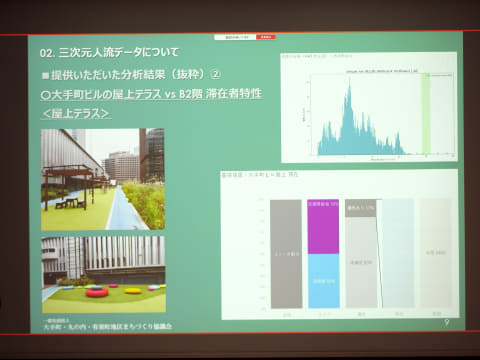 「3次元のデータということで、つい3次元的な分析が必要であると思っていたのですが、例えば駅で地下の人流だけを分析したい場合は地上の人流がノイズになってしまうので、高さ情報を活用して階層を分離することで『地上を歩く観光客は少数がゆっくりと滞在し、地下は駅を利用する人が多いので多数の人が短時間で行き交う』といった実態が分かるようになります。大丸有エリアの分析では、平均滞在時間が地上では274.5分であるのに対して地下では90分と、大きく異なる結果となりました。今までは地上も地下も区別がつかなかったのですが、高さ情報を使うことで精度の高い2次元データとして分離できるというのが今回の実証の大きな成果の1つだと思います。」(一之瀬氏)