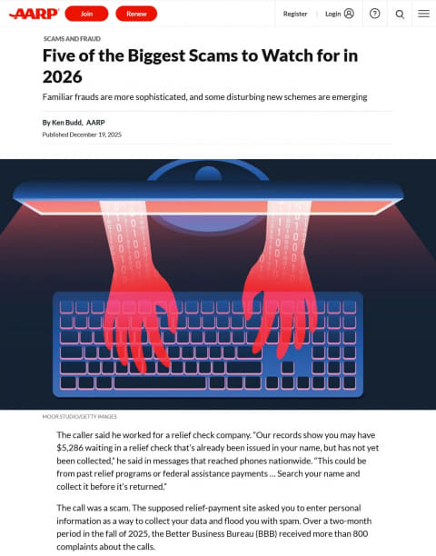 米国には、AARP(全米退職者協会)という影響力の大きな非営利団体があります。50歳以上の人々を対象に、生活の質の向上や社会参加を支援し、会員数は約3800万人を誇ります。医療、雇用、そしてセキュリティに関する彼らの発信は、米国の高齢者社会における羅針盤のような役割を果たしています。そんなAARPが、2026年に特に警戒すべき「5つの詐欺」についての予測と警告を発表しました。