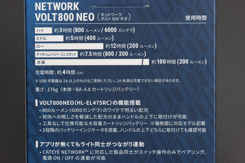 まずフロントライトであるNETWORK VOLT800 NEOだが、ネットワーク機能を除けば、前回紹介した「VOLT800 NEO」と見た目もスペックもほぼ同じだ。なので、詳しくは前回の記事を読んでほしいが、端的に言って非常に満足度は高い。