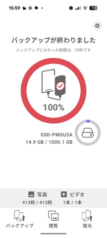 アプリを起動してSSDをUSBポートに接続すると、自動的に差分のバックアップが開始される。その後[閲覧]から、SSD内の写真と動画を閲覧できる。