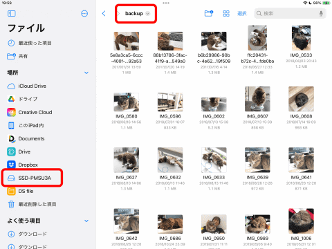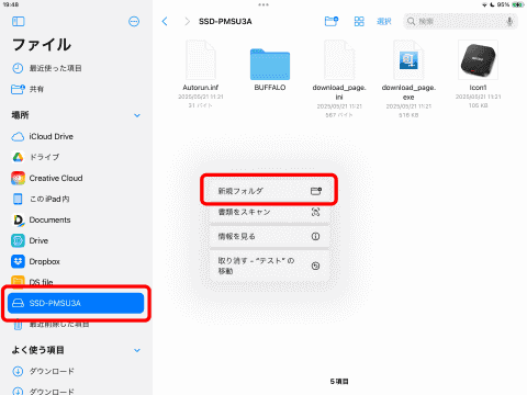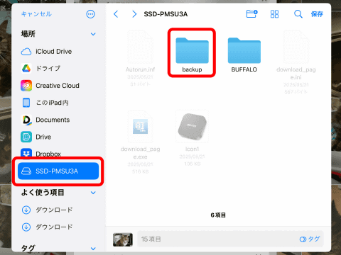 今回は、変換アダプターから電源を供給して、バッファローの外付けSSD「SSD-PMS1.0U3-BA」(1TB)を接続して実践する。電源を供給して外部ストレージを接続すると、「ファイル」アプリで外部ストレージを認識可能になる。はじめに外部ストレージ内にバックアップするためのフォルダを作っておくと、作業が楽だ。