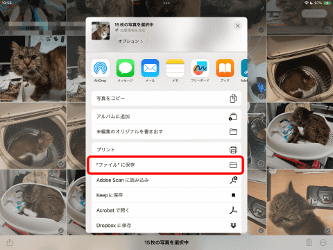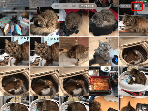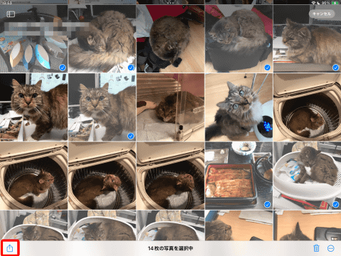 なお、1つずつタップするのでなく、縦横になぞるようにスライドさせることで、連続して選択することもできる。選択できたら、左下の「共有」アイコンをタップする。