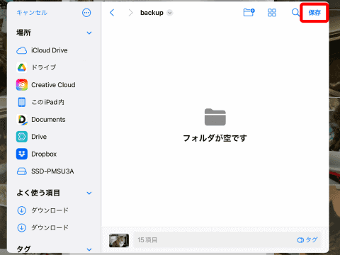 [保存]をタップした後は、バックアップが完了するまで、しばし待つ。うまくできたかは、「ファイル」アプリで確認するといいだろう。