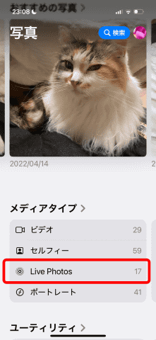 さて、Live Photosがそのままバックアップできないという問題だが、解決策を模索してみよう。Live Photosは「写真」アプリの[メディアタイプ]で[Live Photos]を選ぶと、まとめて表示させることができる。