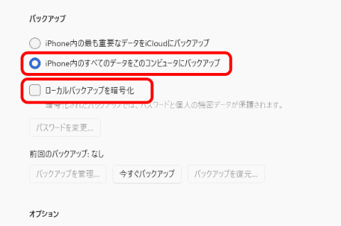 設定では、[iPhone内のすべてのデータをこのコンピュータにバックアップ]をトグルで選択しておく。そして、その下の[ローカルバックアップを暗号化]をチェックしておく。これにチェックを入れておかないと、アクティビティやヘルスケア、キーチェーン(「パスワード」アプリ)のデータがバックアップされない。これらのデータは重要なので必ずチェックしておこう。