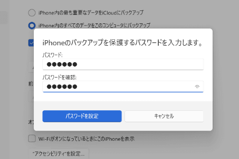 チェックをオンにすると、パスワードの設定画面になるので、パスワードを設定して覚えて(メモなどに控えて)おく。これは復元時に入力が必要になる。