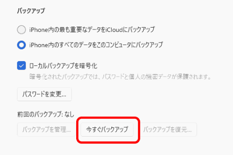 [ローカルバックアップを暗号化]にチェックを入れたら、右下の[適用]をクリック後に[今すぐバックアップ]をクリックすれば、バックアップが開始される。