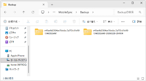 バックアップデータは、「C:¥Users¥(ユーザー名)¥Apple¥MobileSync¥Backup」に保存されるのだが、フォルダーはランダムな文字列になっていて、ユーザー側で変更することはできない。
