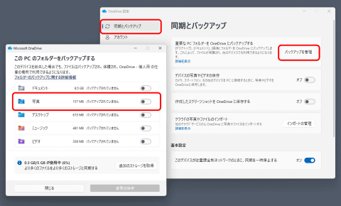 OneDriveでは「ピクチャ(写真)」フォルダーが自動的に同期されるされる設定になっている場合があるため、同期させたくない場合には、設定を変更しておくといいだろう。OneDriveの設定にて、[同期と設定]タブにある「重要なPCフォルダーをOneDriveにバックアップする」と書かれた項目で[バックアップを管理]をクリックすると、フォルダーごとにバックアップするかを決められる。