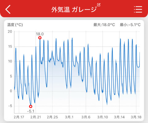 プチプチ設置後、この日の外気温は19時に0℃。その後マイナス5℃くらいまで下がっている。ファンヒーター点火後、調整運転に入る前のピーク温度が少し高めな印象。燃焼停止後に急速に温度が下がり、その後はゆるやかに下がるのはプチプチ設置前と同様だが、下がり方がよりゆるやかになったようにも見えるが劇的な変化はない。