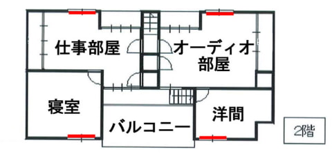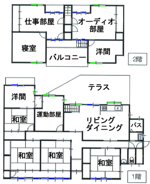 一般的に暖房中の室内から最も熱が逃げるのは窓と言われている。移住した10LDKの物件の間取り図を見ていただこう。緑線は腰高の小さめの窓(サッシ)、青線は人が通れる大きめの窓(サッシ)。1階の南側(間取り図の下方向)は和室3部屋×4枚=12枚の大きめのサッシがある。2階のオーディオ部屋は南側・北側で計8枚、仕事部屋(前室)も同様に8枚。使用していない空き部屋もあるが、やたら窓が多い。