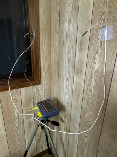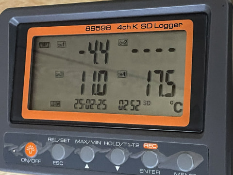 一応、計測を試みた。オーディオ部屋の隣の物置部屋に一時的に石油ファンヒーターを持ち込み、温度ロガーのセンサーを窓の外(外気温)、窓際、室内に設置。寒さが厳しくなった2月に温度変化を計測してみた。