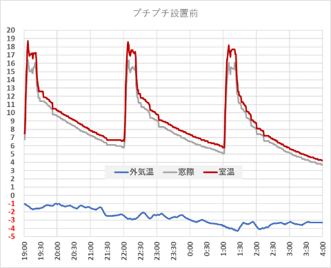 プチプチ設置前、この日の外気温(青線)は19時にマイナス1℃。その後、マイナス4℃くらいまで下がっている。室温は7℃くらい。ファンヒーターの設定温度を18℃にして点火、5分ほどで設定温度に達して調整運転、点火から20分ほどで燃焼停止。室温が7℃くらいに下がったところで再点火、これを3回繰り返した。