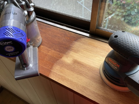 2シーズン目、プチプチ対策をした2階の4部屋のうち、オーディオ部屋以外の3部屋は夏に網戸にして風を通すためプチプチを撤去。冬を前に再びプチプチを貼ることとした。今シーズン重視したのは、窓枠の木部の修繕。長年の結露によるカビと劣化を修復するため、木部の表面を電動サンダーで削って、防カビ、はっ水系の塗装をすることとした。