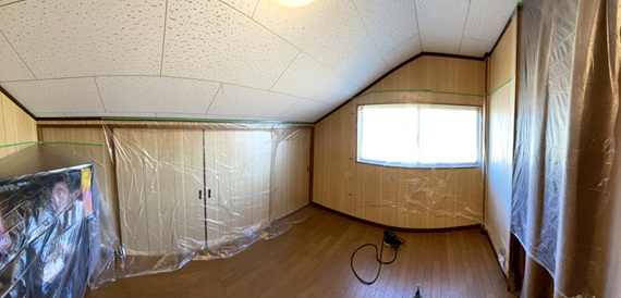 修繕作業は物置部屋からスタート。サンダー、塗装、サンダー、塗装……と3回ほど行ったが、サンダーが撒き散らす粉塵がすごい。次の寝室は粉塵対策を強化したが、部屋を空っぽにしないと万全とは言えなかった。ハードルが高かったのは仕事部屋。窓のすぐ手前にNASとプリンター、すぐ横にPC。これをカーテンで仕切られた前室に移動。修繕作業以上にPC関連の移動に労力を要した。