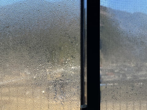 料理をするため、最も結露するのがキッチンの窓。外側にプチプチを貼ったので効果は高く、結露は激減した。さすがに煮物・鍋物で湯気が長時間発生する調理をすると、うっすら曇る。特にガラス面とプチプチの隙間が狭い下部は曇りやすい。ちなみにプチプチ設置前の結露の写真、右側の窓ガラスは少し結露が少なめ。理由は網戸。網戸があるだけでガラス面の温度が変化し結露は少なくなる。