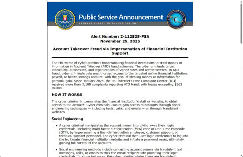 アカウント乗っ取り(ATO:Account Take Over)詐欺についての緊急警告を、米国連邦捜査局(FBI)のインターネット犯罪苦情センター(IC3)が11月25日に発出しました。2025年1月~11月の11カ月間で、IC3が受理した関連苦情件数は5100件を超え、確認された被害総額は2億6200万ドル(約400億円)を超えているそうです。