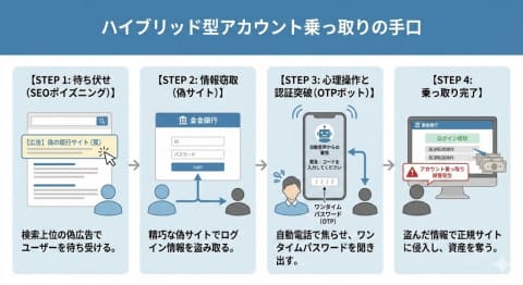 アカウント乗っ取り詐欺は現在、検索サイトを悪用する「SEOポイズニング」という手法や、ワンタイムパスワードを突破するための技術的なハッキングツール、そして人間の心理の隙を突く「ソーシャルエンジニアリング」を組み合わせた“ハイブリッド型”へと進化しています。