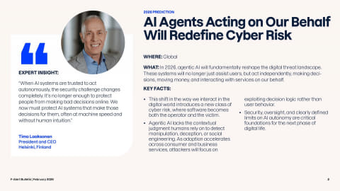 サイバーセキュリティ企業のF-Secureが2月に発表したレポートによると、2026年のサイバー空間では、自律的に判断を下す「AIエージェント」(エージェント型AI)が攻撃の新たな標的になることなどが指摘されています。今回は、同レポートの中で予測されている2026年のサイバー脅威について紹介します。