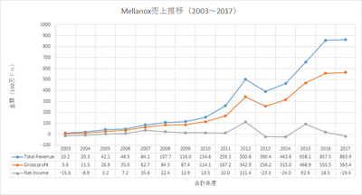 では実際の当時の状況を確認してみよう。Mellanoxの投資家向け資料から、総売上(Total Revenue)、粗利益(Gloss Profits)、純利益(Net Income)をまとめたのが以下のグラフだ。単位は100万ドルで、厳密に言えば為替レートの変動があるので正確さには欠けるが、ラフに100万ドル≒1億円と見なせば、ほぼ当時のInfiniBandの市場規模が見えてくる。