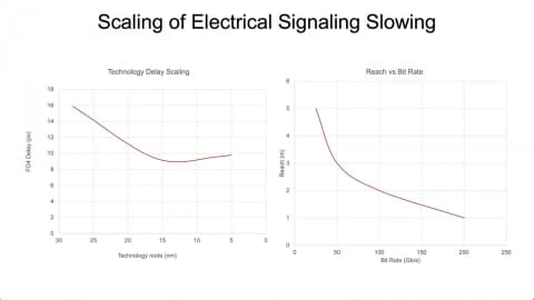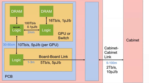 あくまでもコンセプトではあるのだろうが、なかなか無茶な構成ではある。PIC/EICをGPU/Switchのそばに配し、間を空中配線で繋ぐというのは量産ではありえない構成ではある。今ならEIC/PICのダイとGPU/Switchのダイを同じパッケージに収め、間をInterposerでつなぐ形になるだろう。