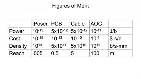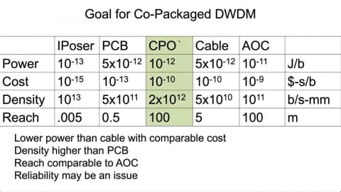話を戻すと、Interposer(チップ同士の接続に利用するもの)/PCB(マザーボードとかGPUカードなどの基板)/Cable(銅ケーブル)/AOC(Active Optical Cable:光ケーブル)でのそれぞれの得失をまとめたのが図03であるが、現時点ではAOCは一番コスト面で不利であり、また消費電力も決して良いとは言えない。