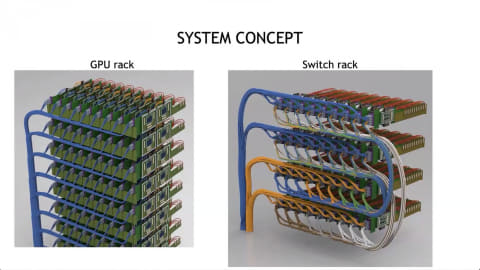 もちろん、実際にはこんな高密度での集積は不可能(そもそもGPUもSwitchも、熱伝導プレートどころかヒートシンクすらついてないので、通電した瞬間にチップが熱で死にそうだ)だが、まぁ、言いたいことは分かる。