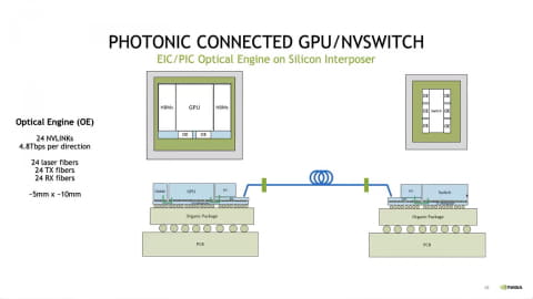 GPUに2組のOE(Optical Engine)が搭載され、ここからNVLink Switchに光ファイバーで接続されるという構図だ。24本のNVLinkを搭載し(ということは、OEあたり12対24本の光ファイバーが出る計算になる)、トータルで片方向あたり4.8Tbpsなので1本あたり200Gbpsという計算になる。
