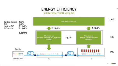 OEの大きさは5mm×10mm程度とされるので、HBMの半分くらいの体積となる。これを見ていると、OEの構造は下にPICが搭載され上にEICが載る格好で、PICにTSVが設けられ、InterposerからTSV経由でまずEICに信号が渡り、そこからPICに信号が渡されるというTSMC方式に近い。この際の必要となるエネルギーの想定値が、図09となる。