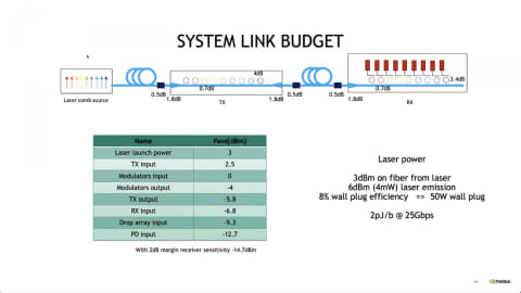 Link Budget、つまり経路での信号損失に関しての算出もあり、トータルで-12.7dBほど。そこに2dBのマージンを乗せて、PD(Photo Detector)の感度は-14.7dBあれば良いとされている(図10)。これは比較的容易に実現できる数字だし、PAM4とかならともかくNRZだったらSNRも比較的高く取りやすいので、実現への支障も少なそうだ。
