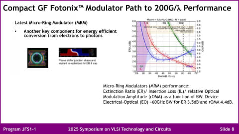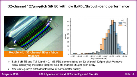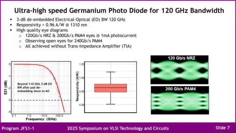 肝心の光信号の送受信性能だが、まずPhoto Diodeは120Gbps NRZ/200Gbps PAM4のどちらのケースでも十分なSNR比と受信感度を備えているとしており(図03)、送信側ではMRMを利用した変調器も200Gbps/λに対応できる(図04)としている。また内部の導光路の構築に関しても、SiベースからSiNベースにすることで、当初は4dB/cm近かった損失が、0.3dB/cm未満まで削減できたとしている。