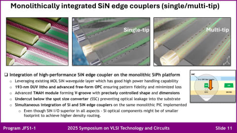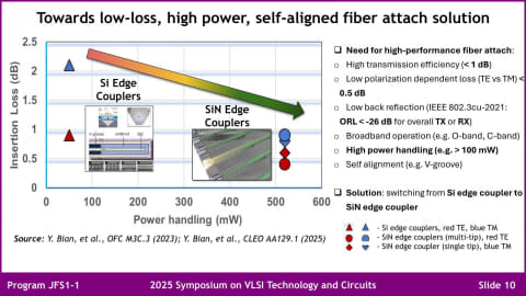 外部の光ファイバーと接続するためのFiber Attachに関しても、当初のものに比べて1dB前後の損失削減が可能になっており、特に最新のものは500mWを超える出力のサポートが可能になったとする(図06)。特にこの接続部を、通常のCMOSのプロセスを利用して構築できる(ので精度が高い)というのは、わざわざスライドを別に用意するほど(図07)大きなメリットと同社は説明する。