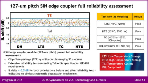 実際に32本のFiberを127μmピッチで並べた場合の特性は、250μmピッチで16本並べた場合と同等以上の特性で、帯域を倍増できるとしている。信頼性試験の結果(図08)も良好で、挿入損失のシフトは±0.5dB以内に収まっているとされる。