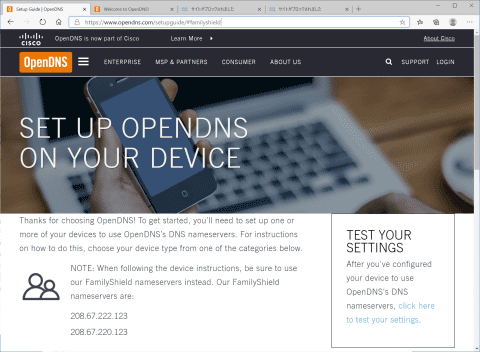 OpenDNS Family ShieldのDNSサーバーのアドレスは、こちらのウェブページに掲載されている次のアドレスとなる。