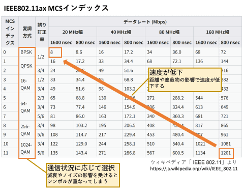 このため、冒頭で紹介したMCSインデックスの値を下げ、より干渉や減衰に強い変調方式に切り替えることで、速度を落としてでも、より確実にデータを伝送できる方式が選択されることになるわけだ。