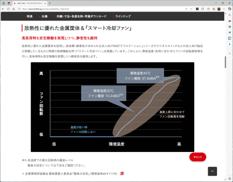 バッファローのウェブサイトに公開されている方法によると、環境温度と負荷に応じて回転数を制御するようになっているようで、ファン最大回転時の騒音レベルは環境温度が30℃の場合で10.2dBA、40℃の場合で37.9dBAとなっている。
