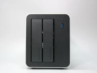 本製品はHDDを2台まで搭載できる2ベイNASだ。筐体は、本体の6面のうち、正面と背面を除いた左右側面および上下の4面が一体成型となったアルミ製(要するに金属部分は筒状)で、厚みも2.5mmほどあり、非常にしっかりとした作りになっている。