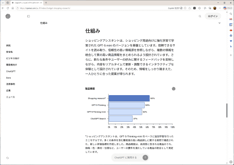 OpenAIの公式情報によると、ショッピング用途向けに強化学習で学習したGPT-5 Thinking-miniモデルを利用しており、「信頼できるサイトを読み取り、信頼性の高い情報源を参照しながら、複数の情報を統合して質の高い商品情報をまとめられるよう設計されています」と記載されている。